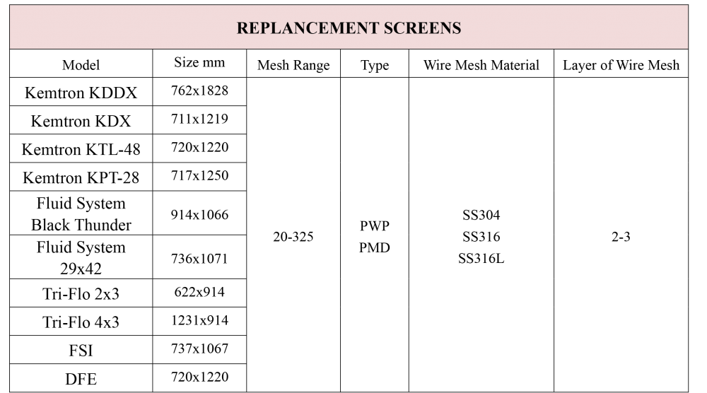 ♦ Replacement Shaker Screens Kem-Tron